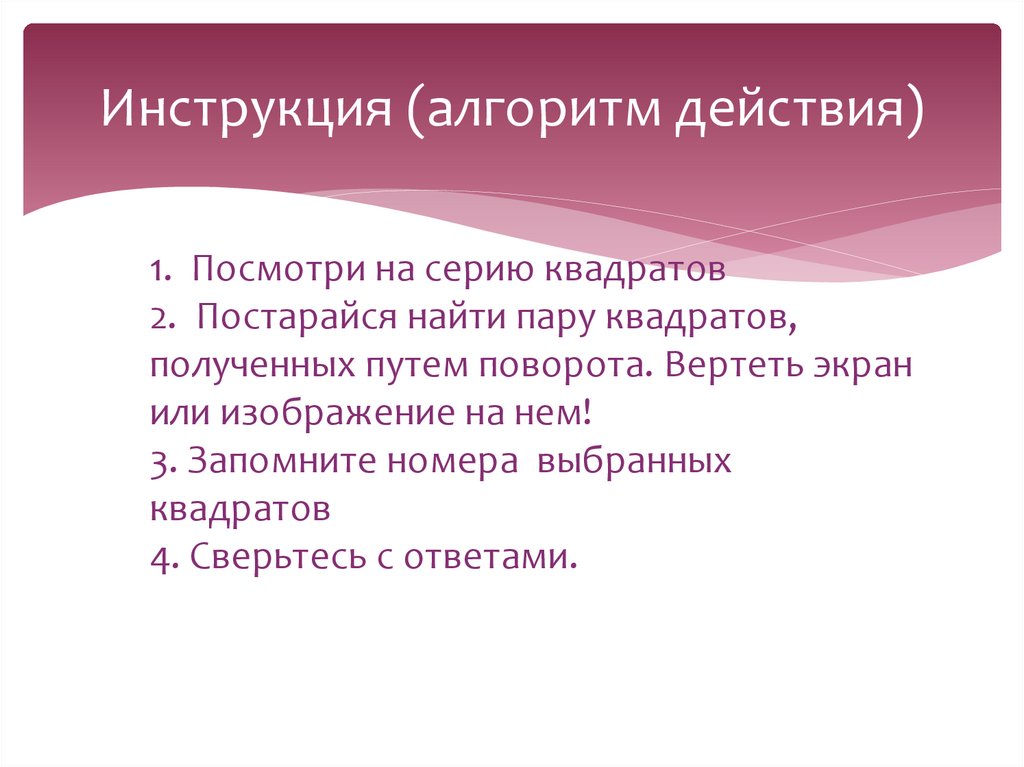 Инструкция (алгоритм действия)1. Посмотри на серию квадратов