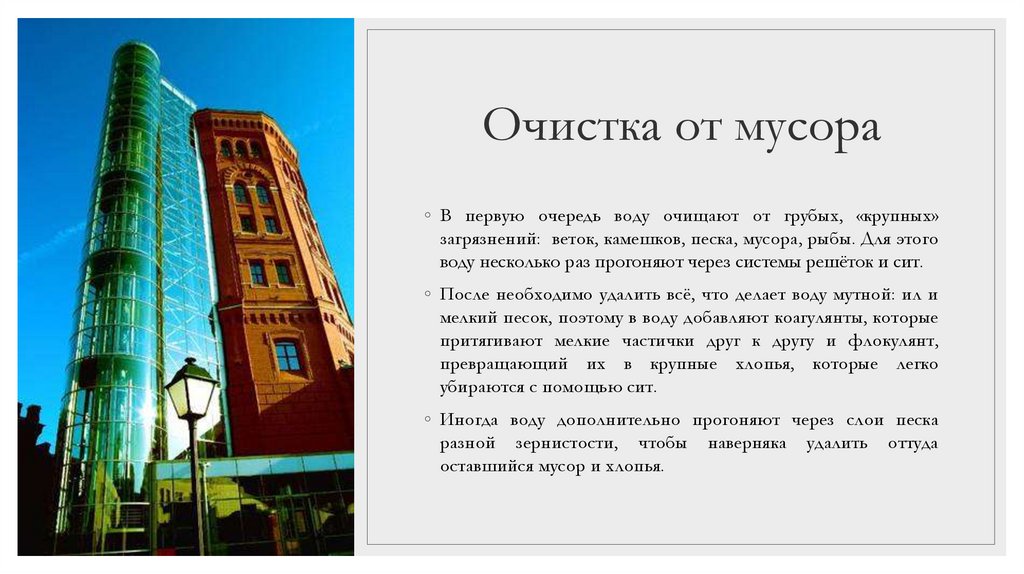 Очистка от мусора◦ В первую очередь воду очищают от грубых, «крупных»