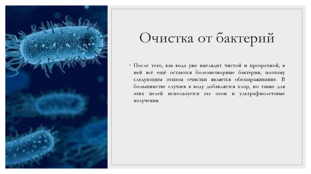 Очистка от бактерий◦ После того, как вода уже выглядит чистой и прозрачной, в