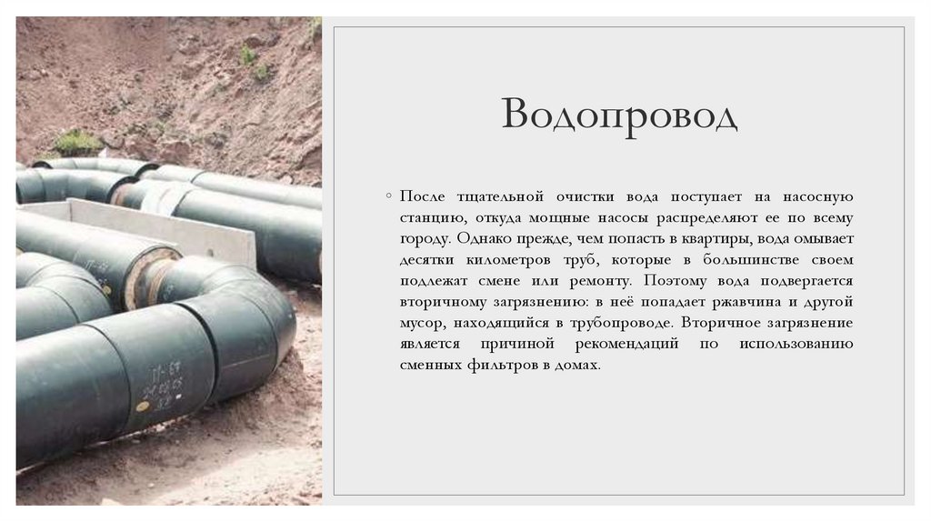 Водопровод◦ После тщательной очистки вода поступает на насосную