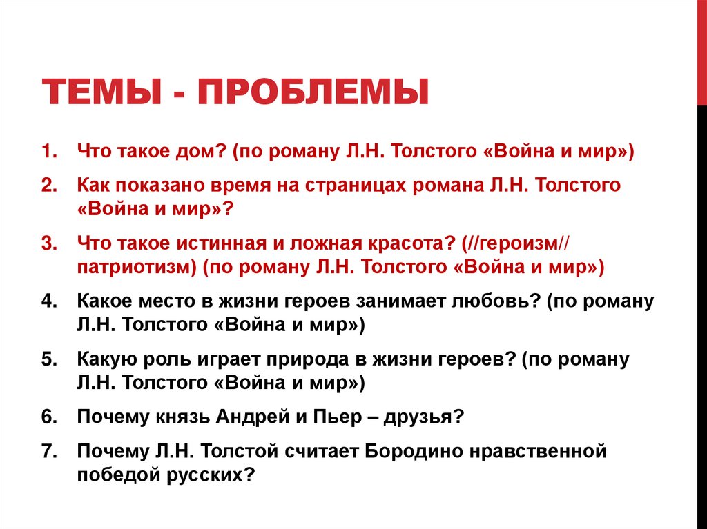 ТЕМЫ - ПРОБЛЕМЫ1. Что такое дом? (по роману Л.Н. Толстого «Война и мир»)