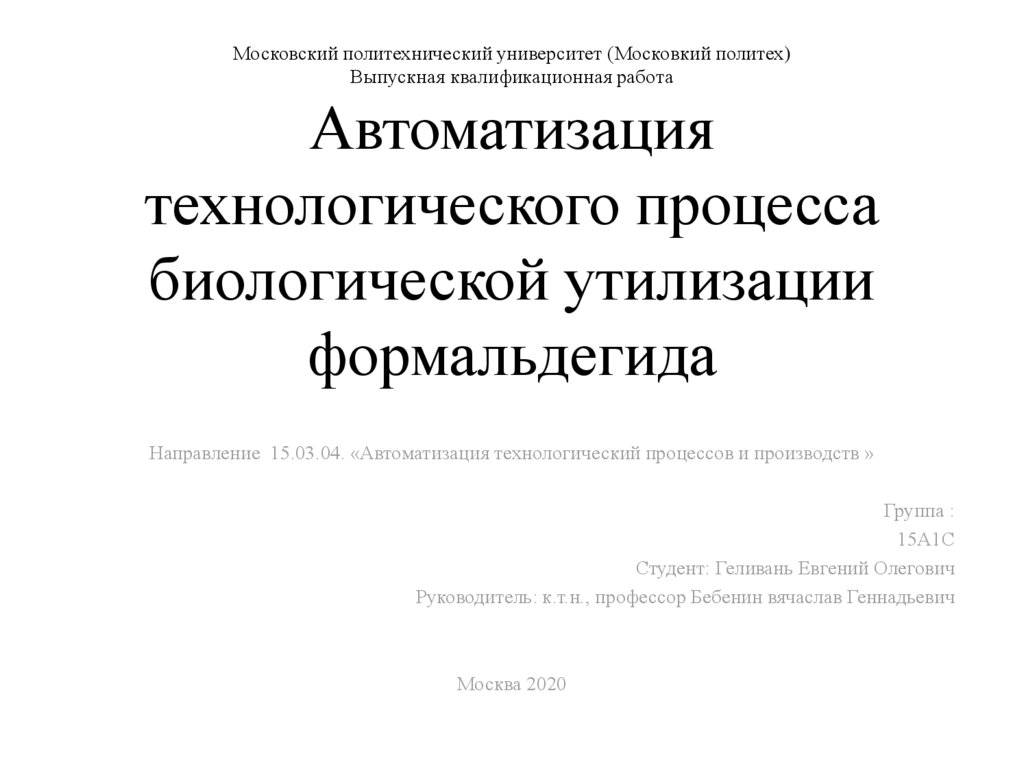 Автоматизация технологического процесса биологической утилизации формальдегида