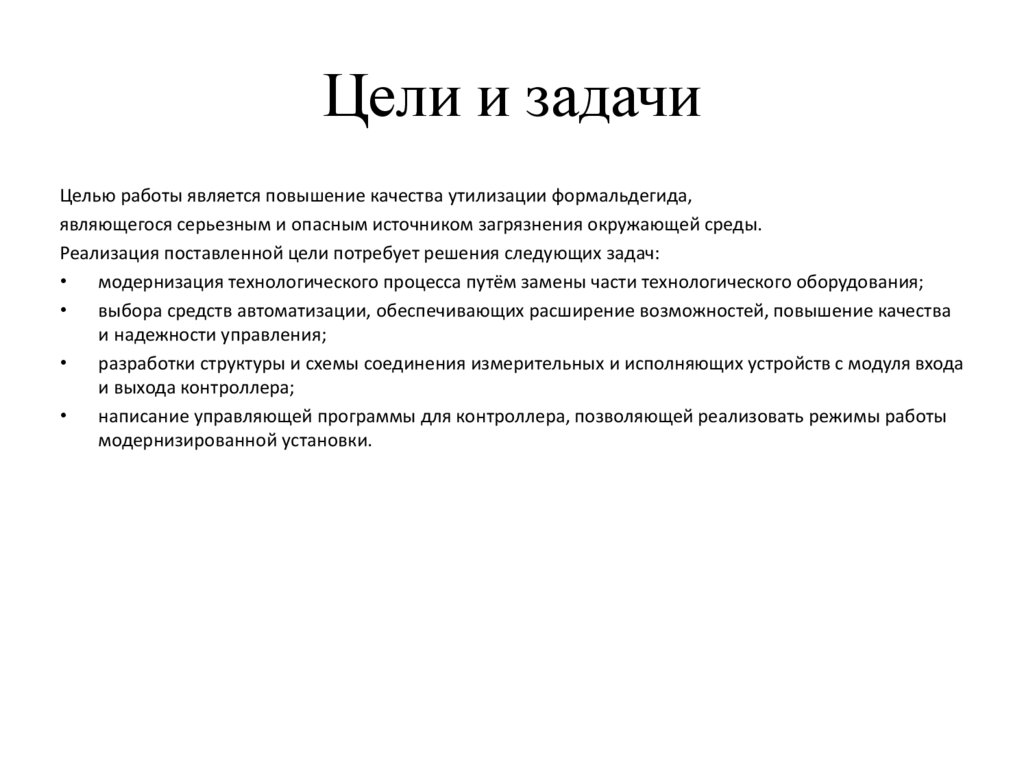 Цели и задачиЦелью работы является повышение качества утилизации формальдегида,