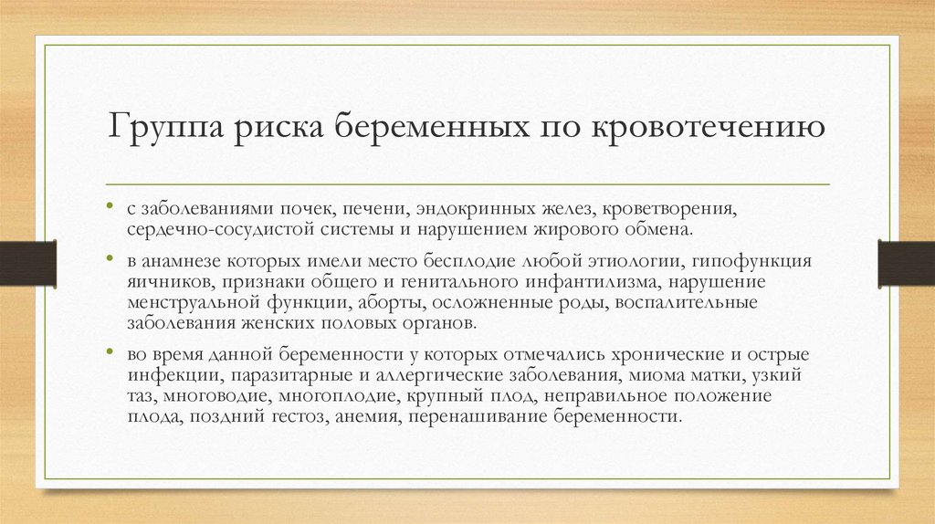 Группа риска беременных по кровотечению• с заболеваниями почек, печени, эндокринных желез, кроветворения,