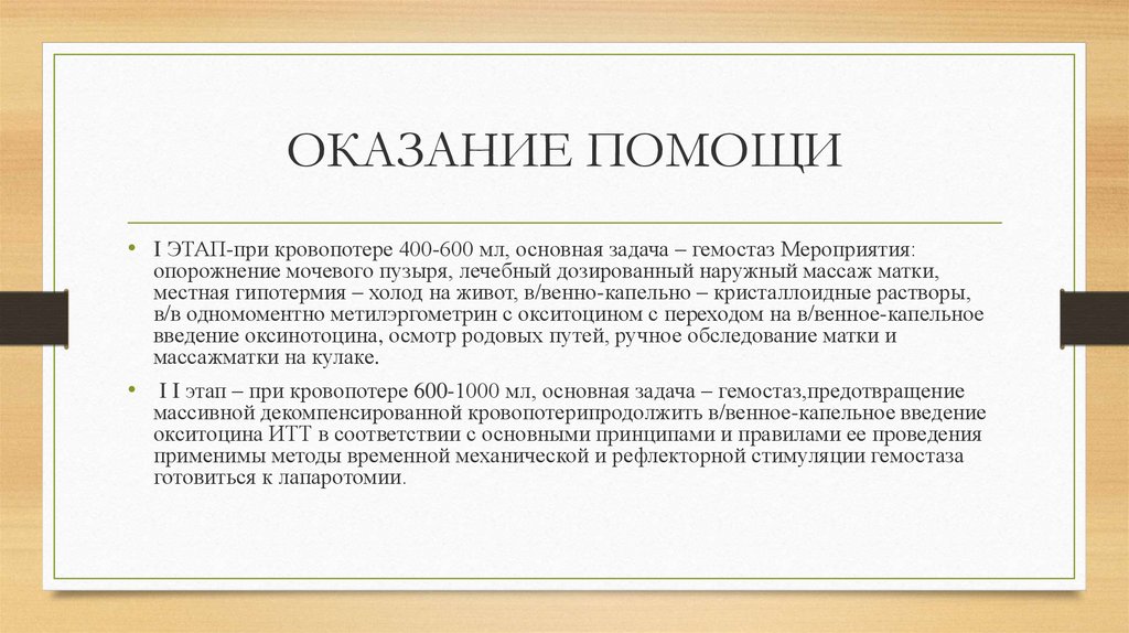 ОКАЗАНИЕ ПОМОЩИ• I ЭТАП-при кровопотере 400-600 мл, основная задача – гемостаз Мероприятия: