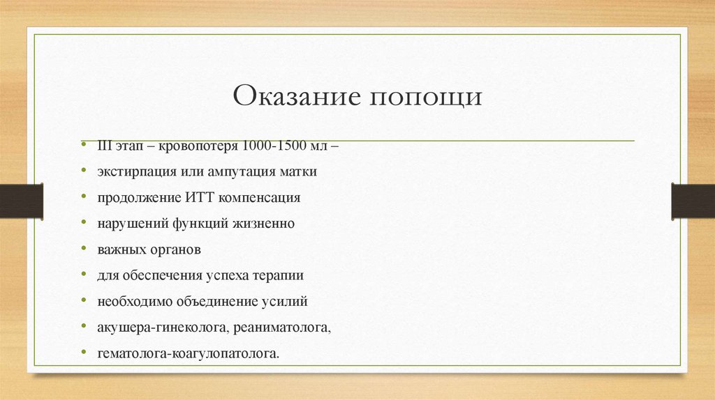 Оказание попощи• III этап – кровопотеря 1000-1500 мл –