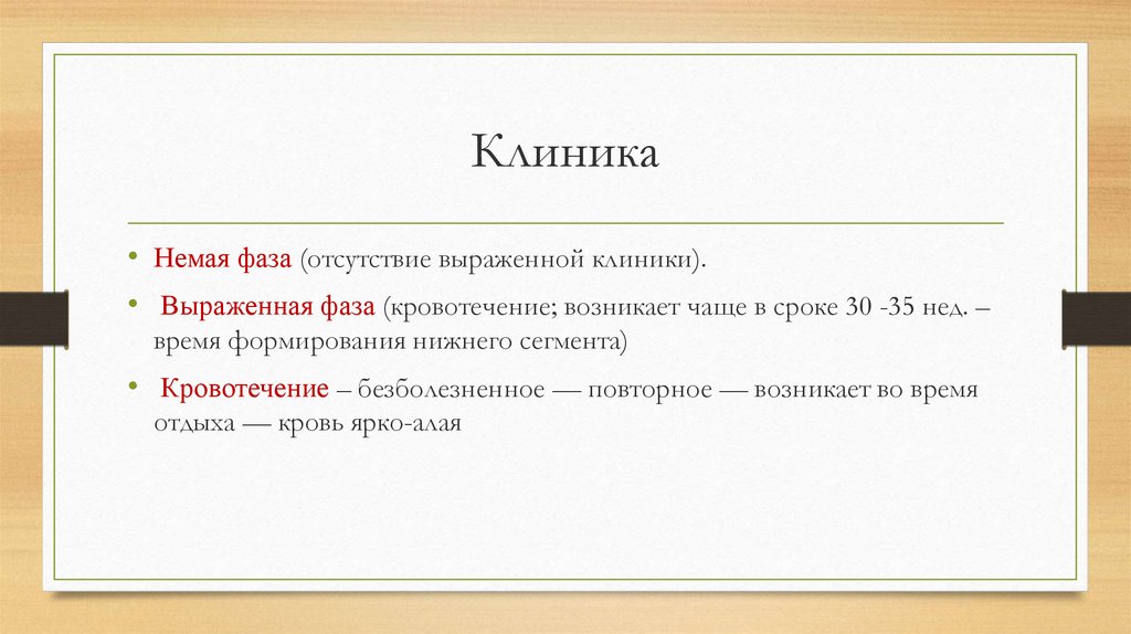 • Выраженная фаза (кровотечение; возникает чаще в сроке 30 -35 нед. –