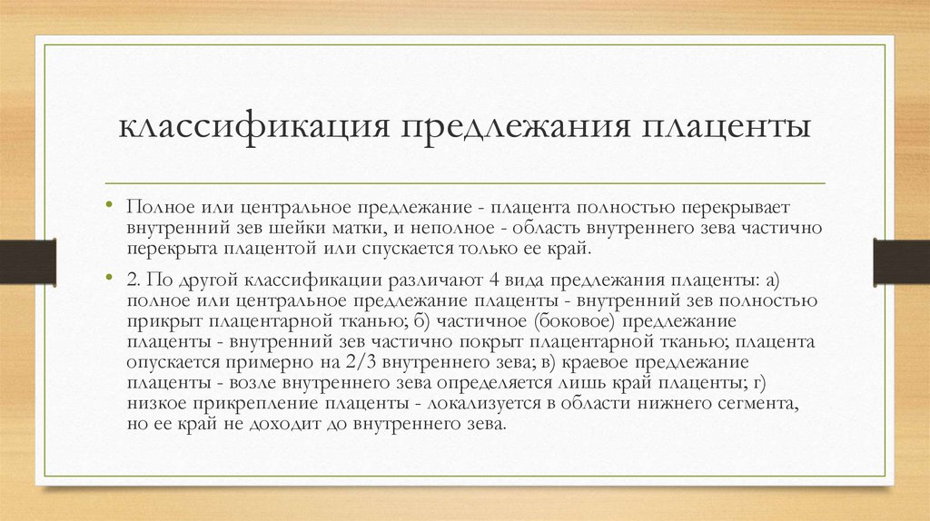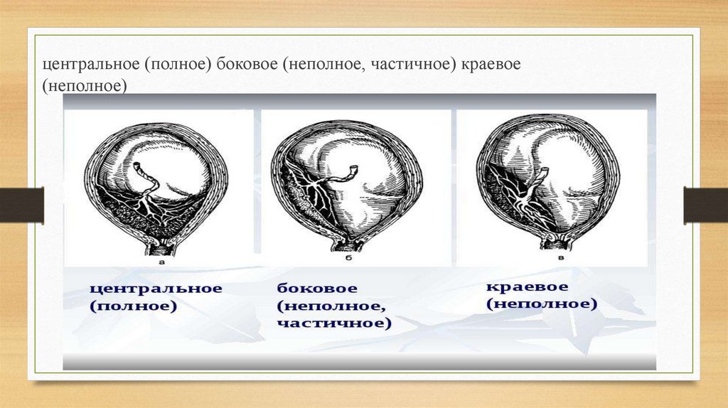 классификация предлежания плаценты• Полное или центральное предлежание - плацента полностью перекрывает