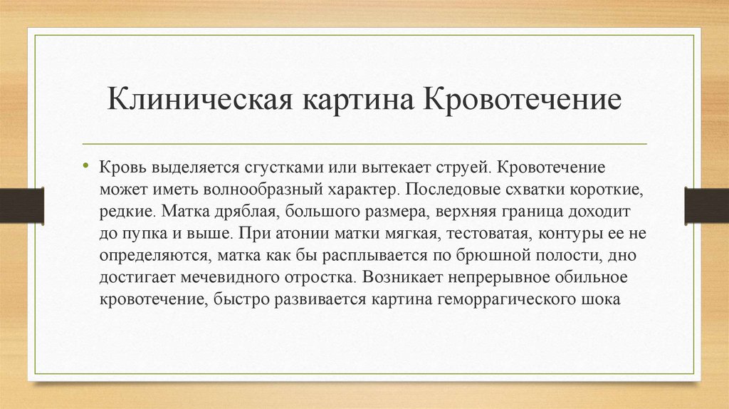 Клиническая картина Кровотечение• Кровь выделяется сгустками или вытекает струей. Кровотечение