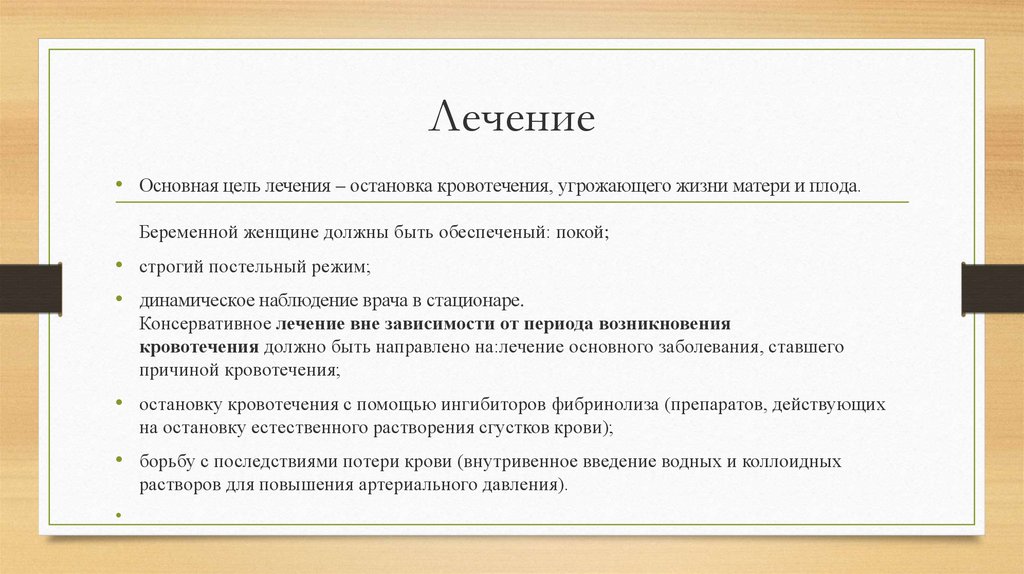 Лечение• Основная цель лечения – остановка кровотечения, угрожающего жизни матери и плода.