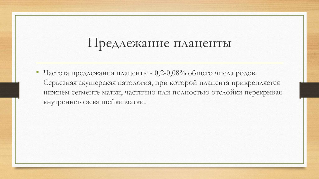 Предлежание плаценты• Частота предлежания плаценты - 0,2-0,08% общего числа родов.