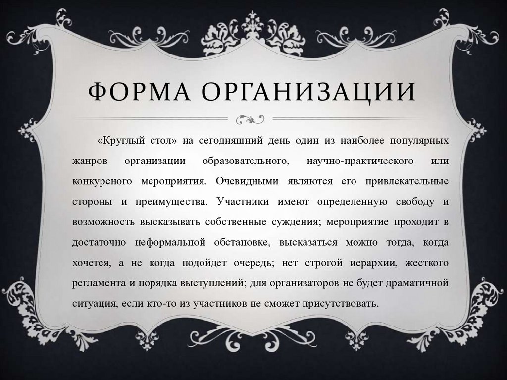 ФОРМА ОРГАНИЗАЦИИ«Круглый стол» на сегодняшний день один из наиболее популярных