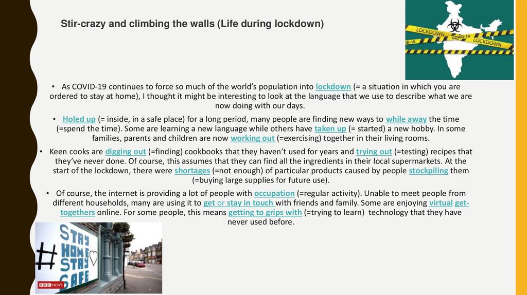 Stir-crazy and climbing the walls (Life during lockdown)• As COVID-19 continues to force so much of the world’s population into lockdown (= a situation in which you are