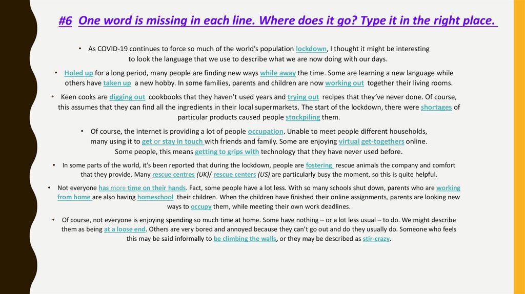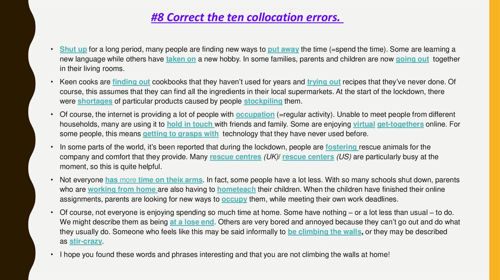#8 Correct the ten collocation errors.• Shut up for a long period, many people are finding new ways to put away the time (=spend the time). Some are learning a