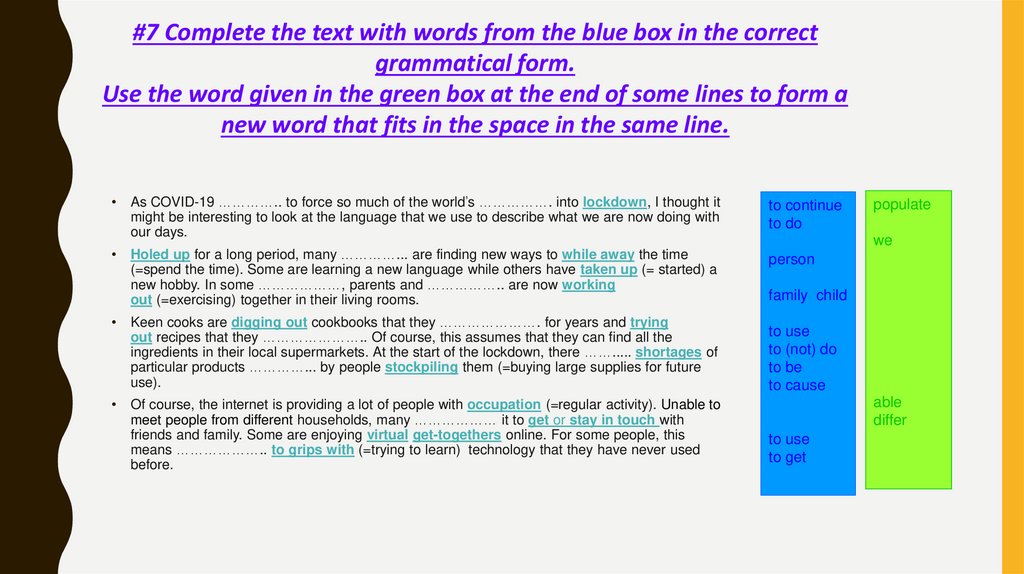 #7 Complete the text with words from the blue box in the correctgrammatical form.