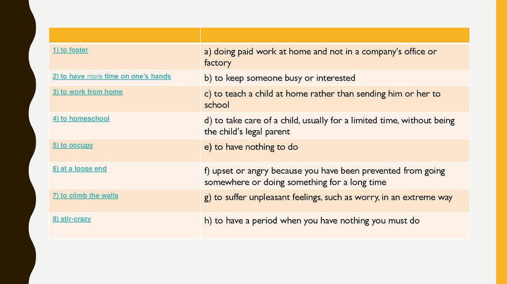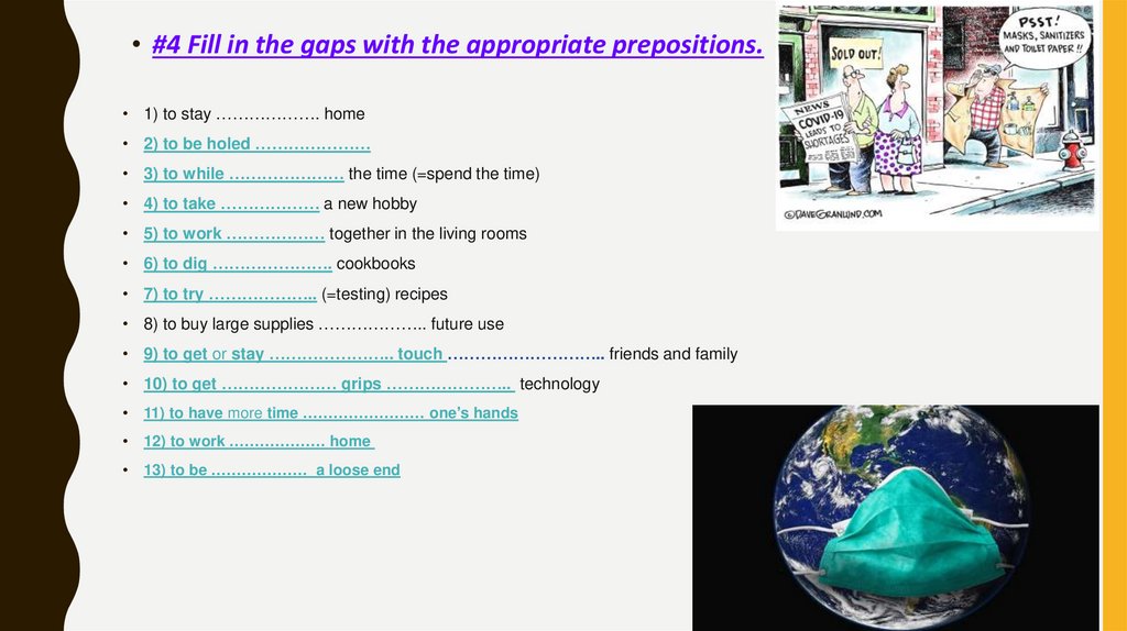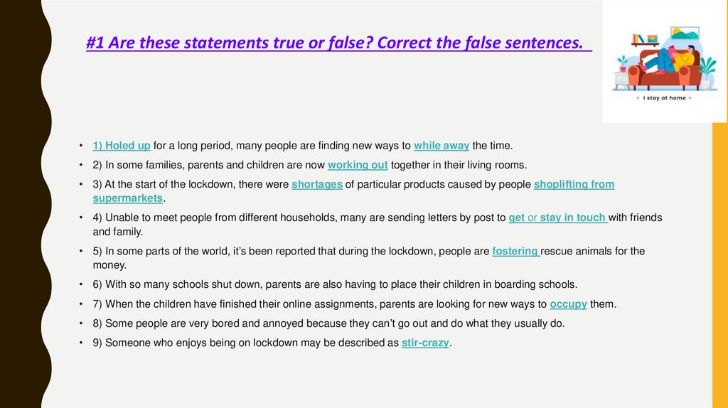 #1 Are these statements true or false? Correct the false sentences.• 1) Holed up for a long period, many people are finding new ways to while away the time.