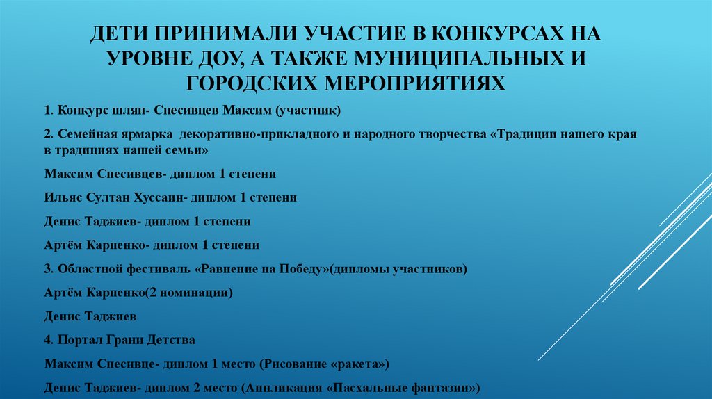 ДЕТИ ПРИНИМАЛИ УЧАСТИЕ В КОНКУРСАХ НАУРОВНЕ ДОУ, А ТАКЖЕ МУНИЦИПАЛЬНЫХ И