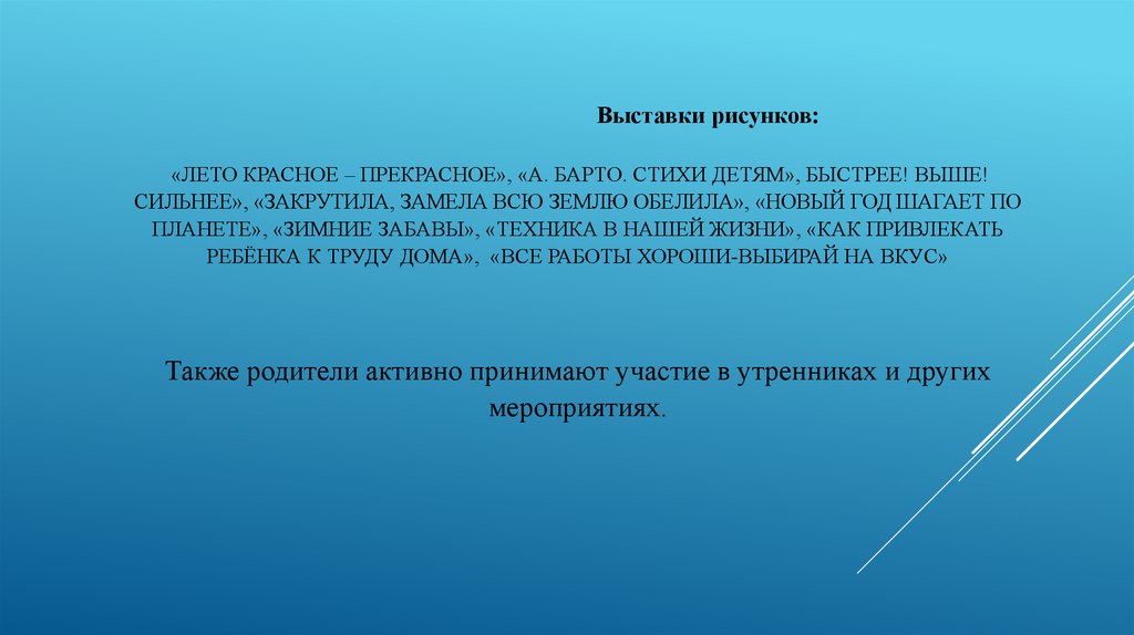 Выставки рисунков:«ЛЕТО КРАСНОЕ – ПРЕКРАСНОЕ», «А. БАРТО. СТИХИ ДЕТЯМ», БЫСТРЕЕ! ВЫШЕ!
