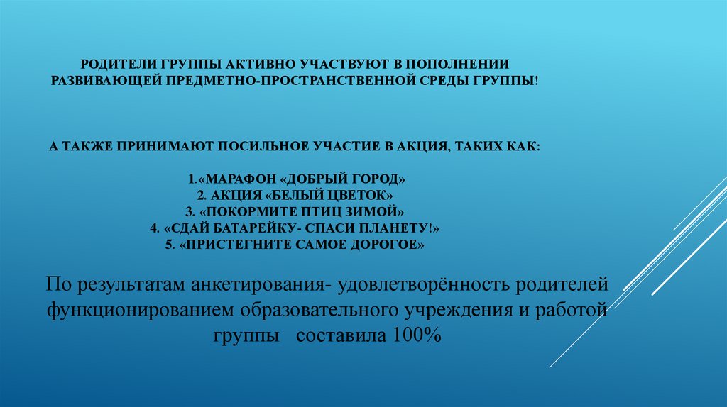 РОДИТЕЛИ ГРУППЫ АКТИВНО УЧАСТВУЮТ В ПОПОЛНЕНИИРАЗВИВАЮЩЕЙ ПРЕДМЕТНО-ПРОСТРАНСТВЕННОЙ СРЕДЫ ГРУППЫ!