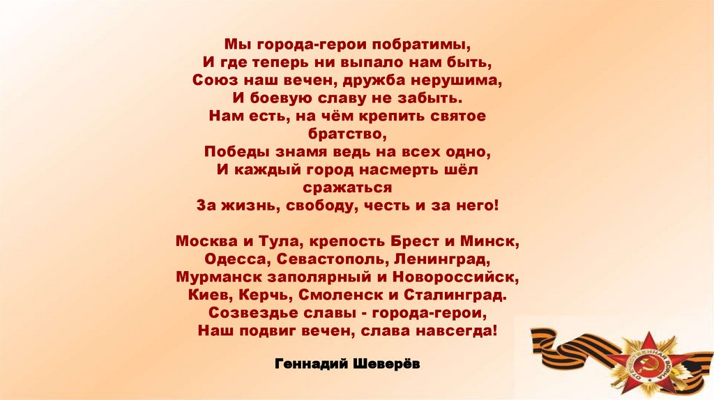 Мы города-герои побратимы,И где теперь ни выпало нам быть,