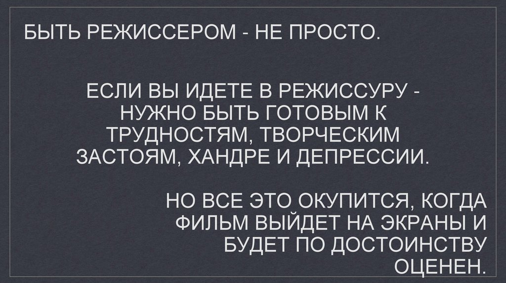 БЫТЬ РЕЖИССЕРОМ - НЕ ПРОСТО.ЕСЛИ ВЫ ИДЕТЕ В РЕЖИССУРУ НУЖНО БЫТЬ ГОТОВЫМ К