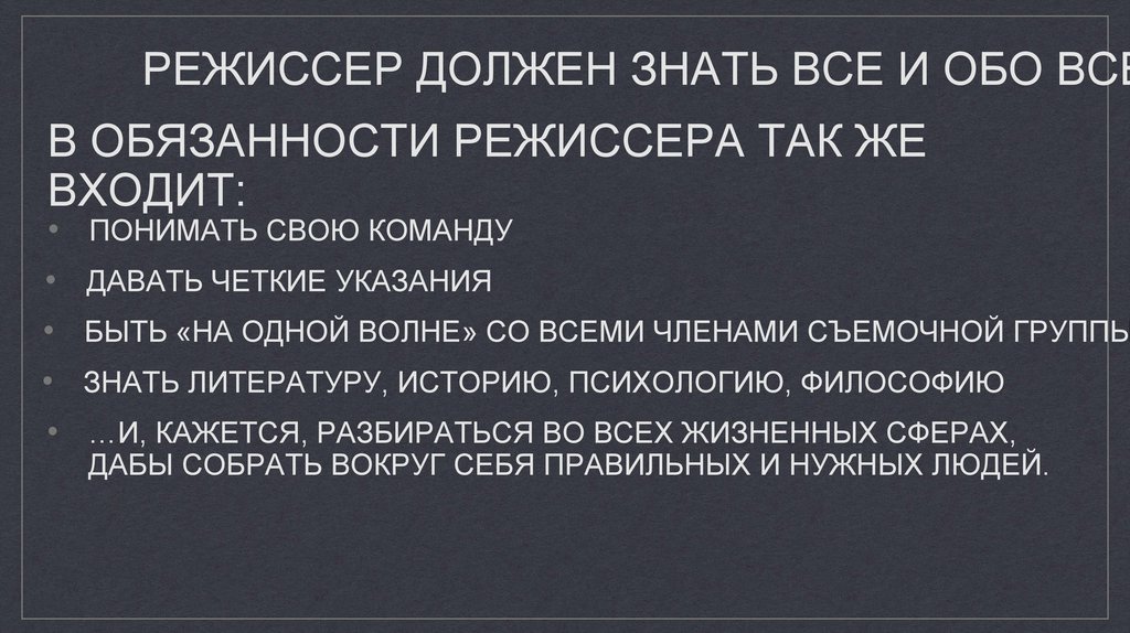 РЕЖИССЕР ДОЛЖЕН ЗНАТЬ ВСЕ И ОБО ВСЕВ ОБЯЗАННОСТИ РЕЖИССЕРА ТАК ЖЕ