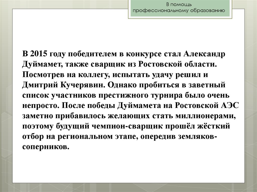 В 2015 году победителем в конкурсе стал АлександрДуймамет, также сварщик из Ростовской области.