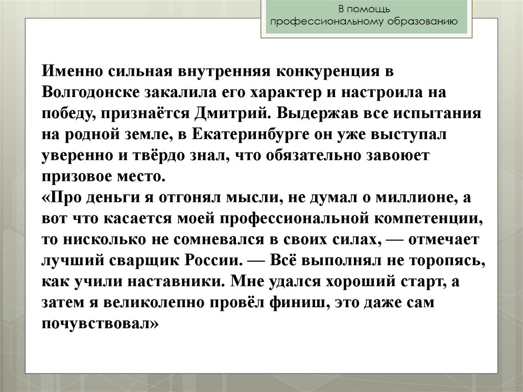 поэтому будущий чемпион-сварщик прошёл жёсткий
