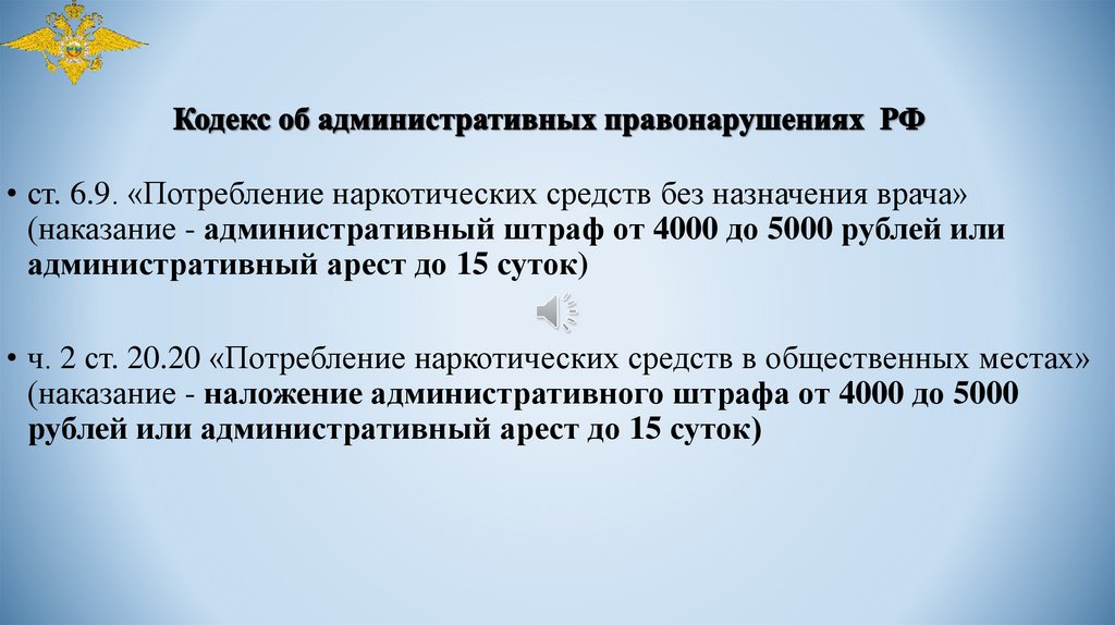 • ст. 6.9. «Потребление наркотических средств без назначения врача»(наказание - административный штраф от 4000 до 5000 рублей или