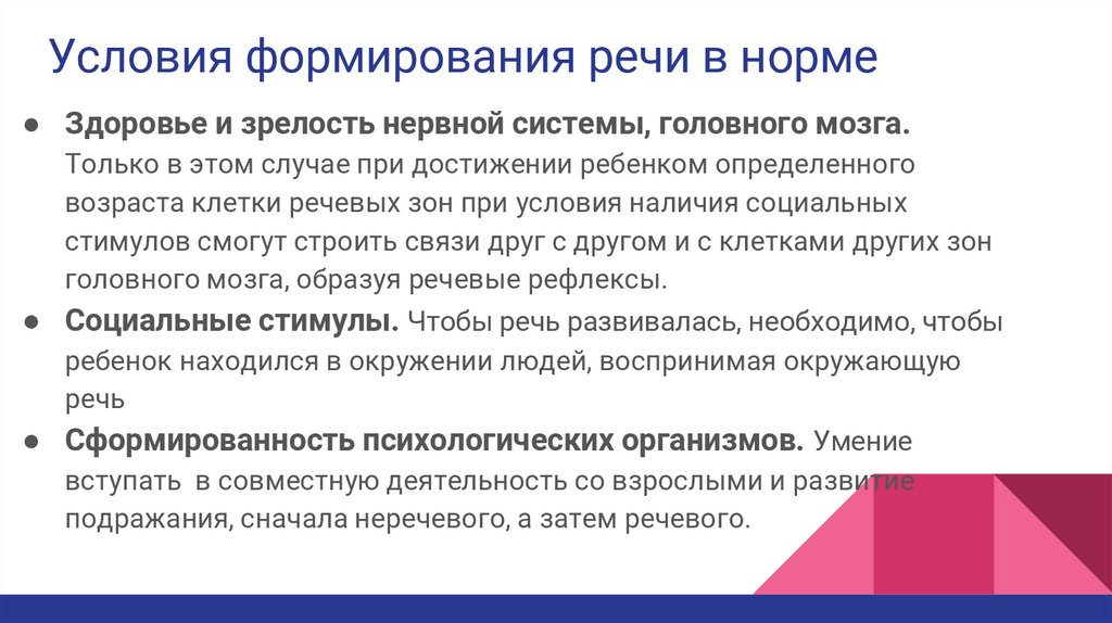 Условия формирования речи в норме● Здоровье и зрелость нервной системы, головного мозга.