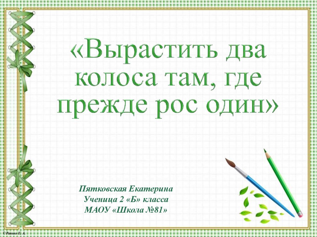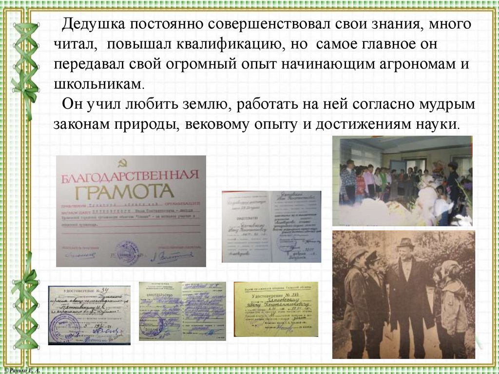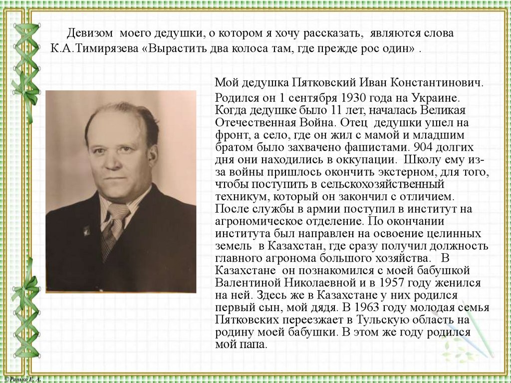 Девизом моего дедушки, о котором я хочу рассказать, являются словаК.А.Тимирязева «Вырастить два колоса там, где прежде рос один» .