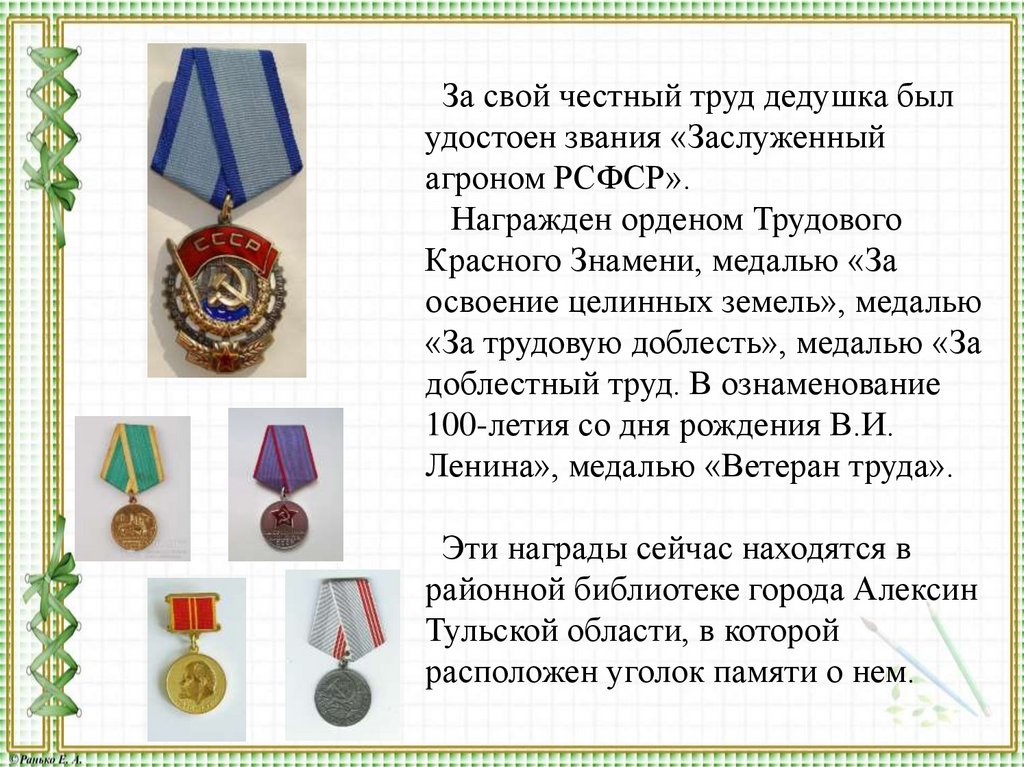За свой честный труд дедушка былудостоен звания «Заслуженный