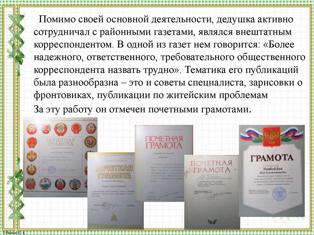 Помимо своей основной деятельности, дедушка активносотрудничал с районными газетами, являлся внештатным