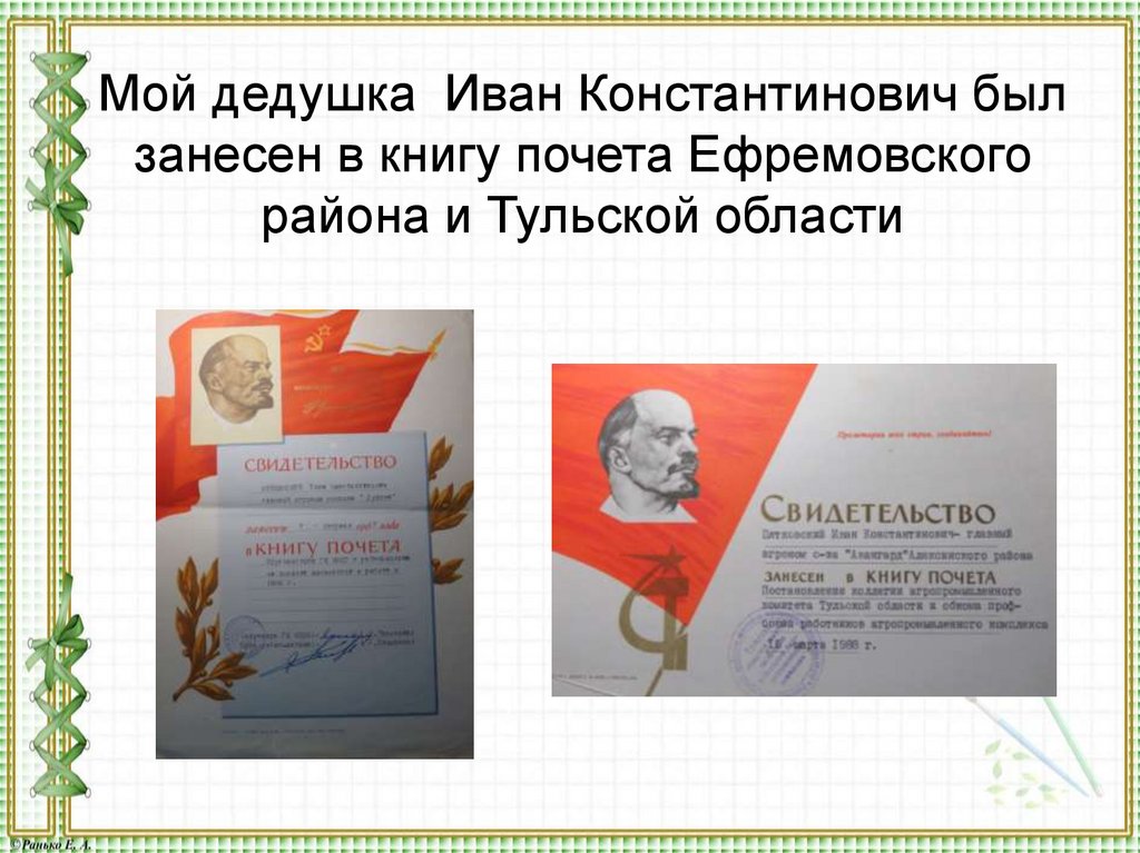 Мой дедушка Иван Константинович былзанесен в книгу почета Ефремовского