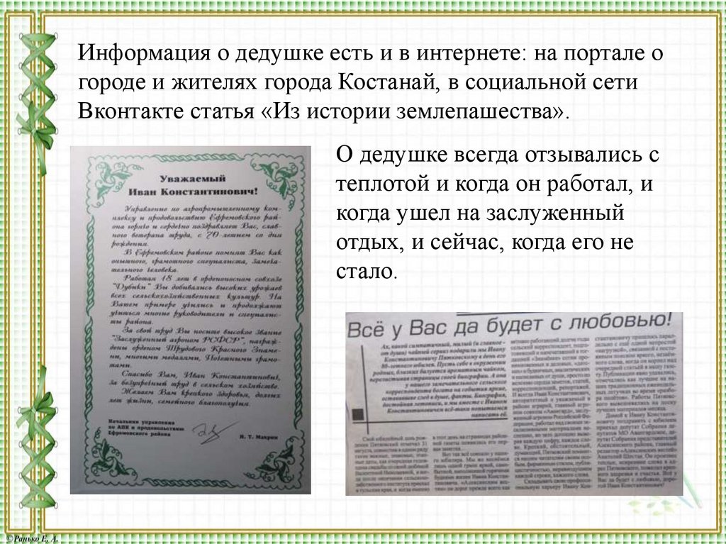 Информация о дедушке есть и в интернете: на портале огороде и жителях города Костанай, в социальной сети