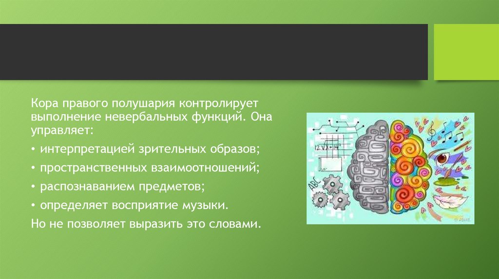Кора правого полушария контролируетвыполнение невербальных функций. Она