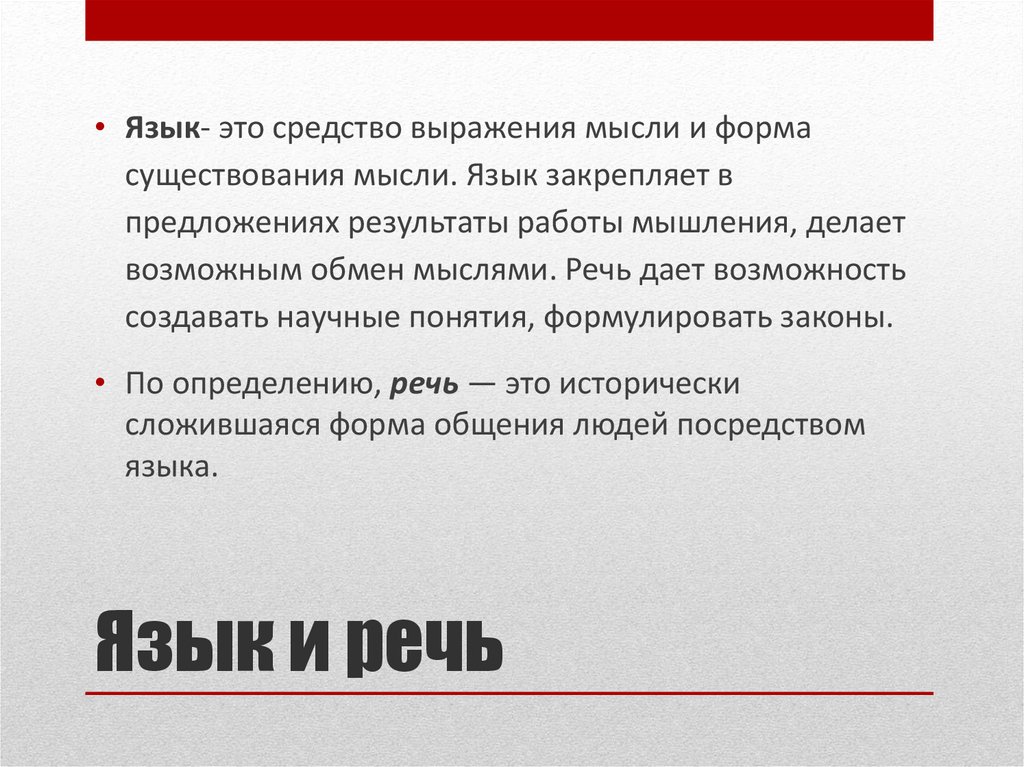 • Язык- это средство выражения мысли и формасуществования мысли. Язык закрепляет в