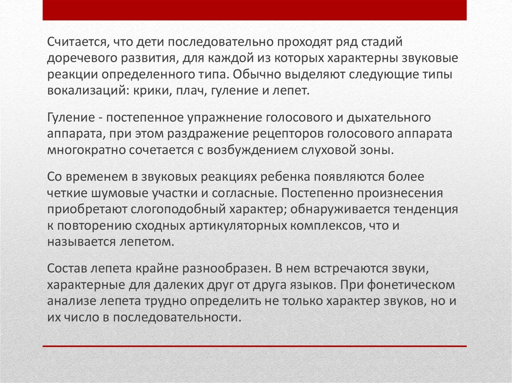Считается, что дети последовательно проходят ряд стадийдоречевого развития, для каждой из которых характерны звуковые