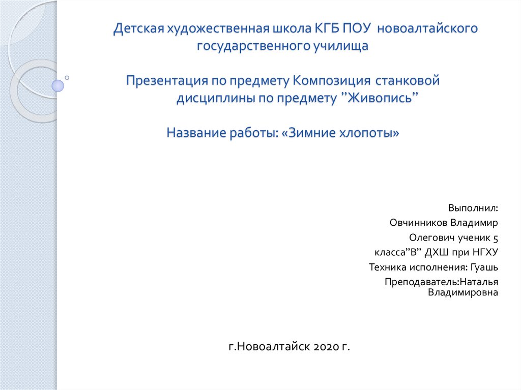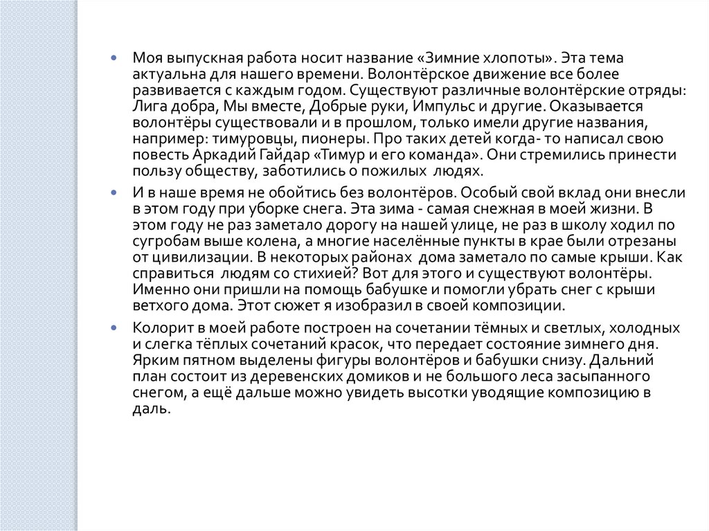 Моя выпускная работа носит название «Зимние хлопоты». Эта темаактуальна для нашего времени. Волонтёрское движение все более