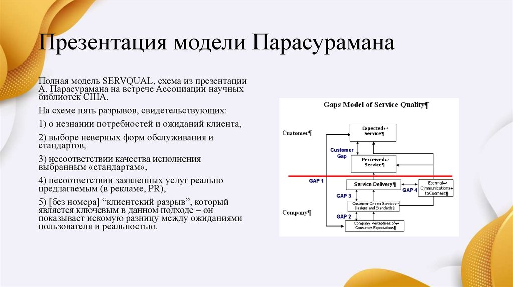 Презентация модели ПарасураманаПолная модель SERVQUAL, схема из презентации