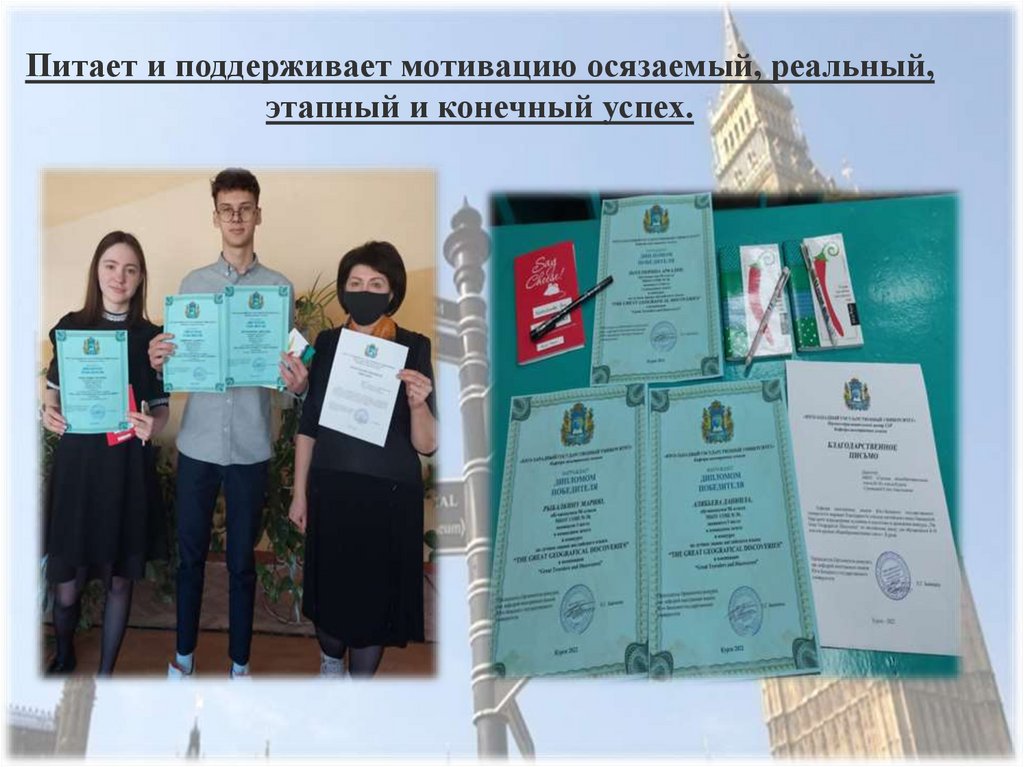 Питает и поддерживает мотивацию осязаемый, реальный,этапный и конечный успех.