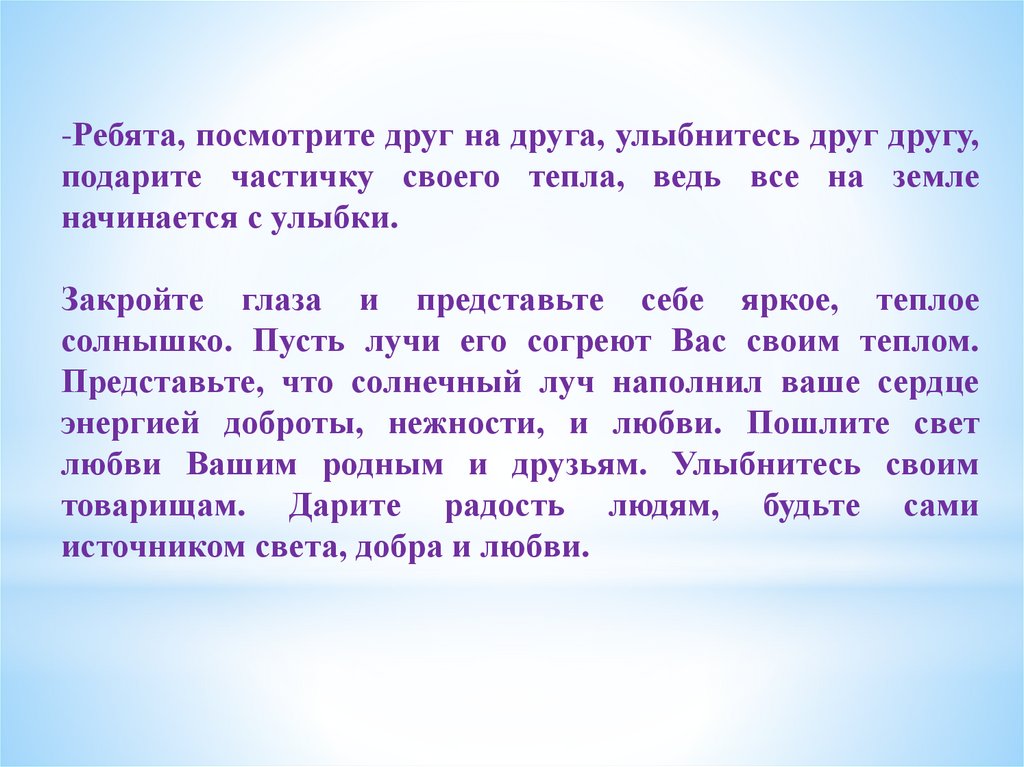 -Ребята, посмотрите друг на друга, улыбнитесь друг другу,подарите частичку своего тепла, ведь все на земле