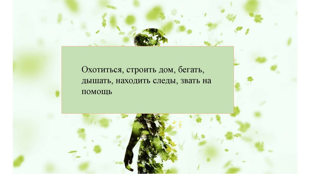 Охотиться, строить дом, бегать,дышать, находить следы, звать на