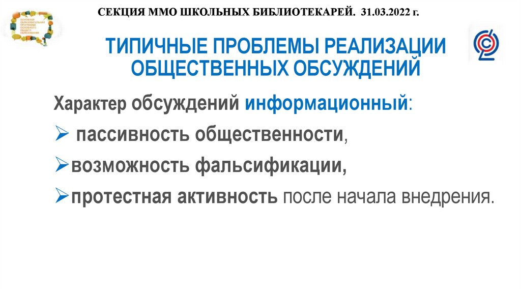 СЕКЦИЯ ММО ШКОЛЬНЫХ БИБЛИОТЕКАРЕЙ. 31.03.2022 г.ТИПИЧНЫЕ ПРОБЛЕМЫ РЕАЛИЗАЦИИ