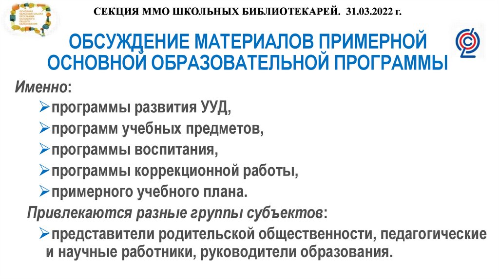 СЕКЦИЯ ММО ШКОЛЬНЫХ БИБЛИОТЕКАРЕЙ. 31.03.2022 г.ОБСУЖДЕНИЕ МАТЕРИАЛОВ ПРИМЕРНОЙ