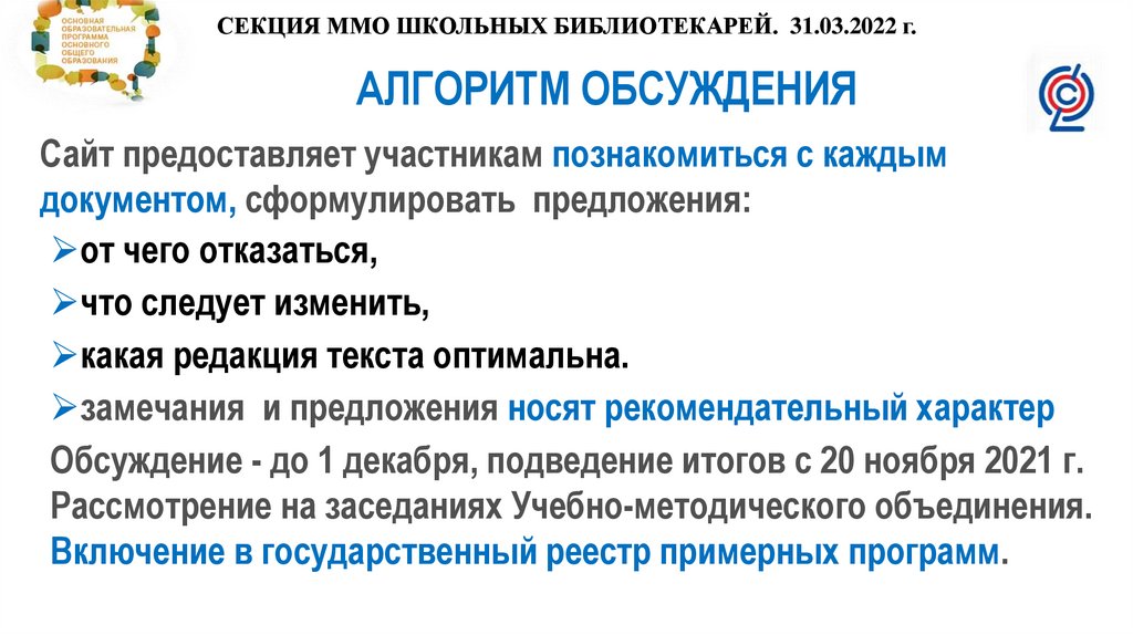 СЕКЦИЯ ММО ШКОЛЬНЫХ БИБЛИОТЕКАРЕЙ. 31.03.2022 г.АЛГОРИТМ ОБСУЖДЕНИЯ