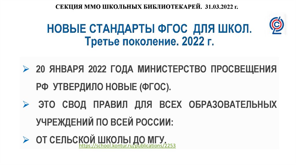 СЕКЦИЯ ММО ШКОЛЬНЫХ БИБЛИОТЕКАРЕЙ. 31.03.2022 г.Новый ФГОС: