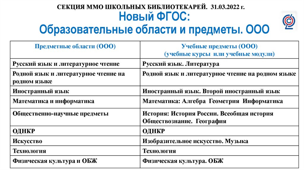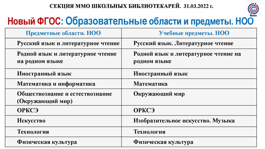 СЕКЦИЯ ММО ШКОЛЬНЫХ БИБЛИОТЕКАРЕЙ. 31.03.2022 г.Новый ФГОС: Образовательные области и предметы. НОО