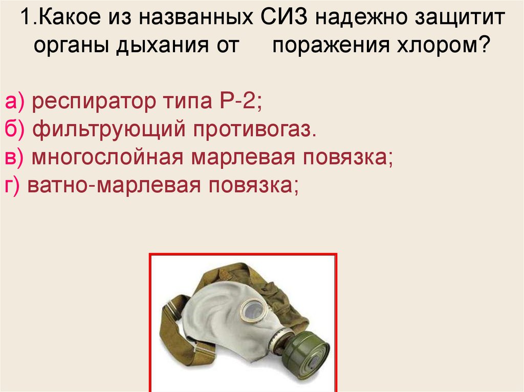 1.Какое из названных СИЗ надежно защититорганы дыхания от поражения хлором?