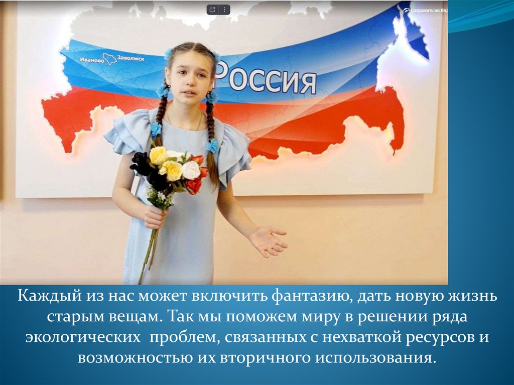 Каждый из нас может включить фантазию, дать новую жизньстарым вещам. Так мы поможем миру в решении ряда